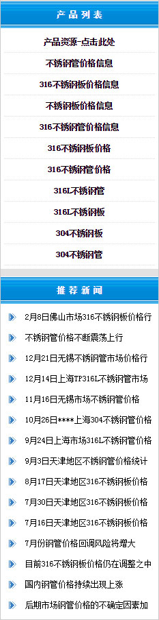 主營品種:不銹鋼管,不銹鋼板,不銹鋼棒,不銹鋼卷板,不銹鋼管件,不銹鋼方管,材質(zhì)為304,304L,316,316L,321,310S,309,2520,2205,904l其中304不銹鋼板,304不銹鋼管,316不銹鋼管,316不銹鋼板長期有現(xiàn)貨供應(yīng),同時提供316不銹鋼板價格和不銹鋼管價格的價格資訊!